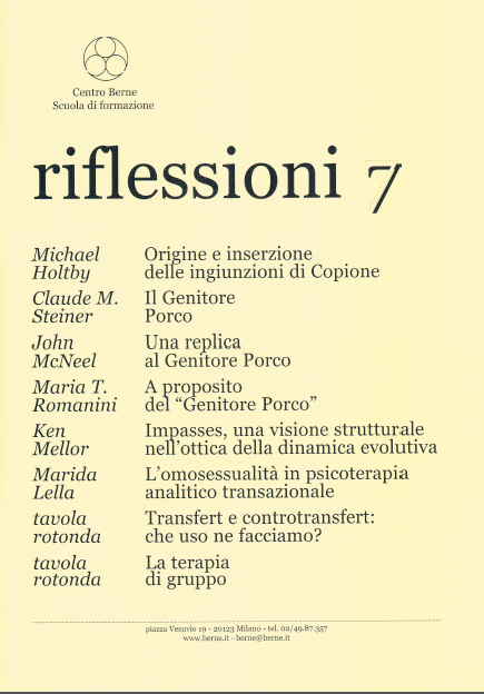 In Riflessioni 7 riproponiamo alcuni articoli, a nostro parere “classici”, che sono stati pubblicati sul T.A. Journal, sulla Rivista Italiana di A.T. e su Neopsiche. I temi riguardano le Ingiunzioni, le Impasses e il Genitore cosiddetto “porco“.